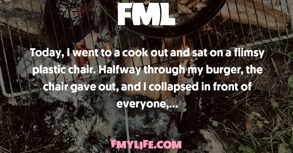 Today, I went to a cook out and sat on a flimsy plastic chair. Halfway through my burger, the...