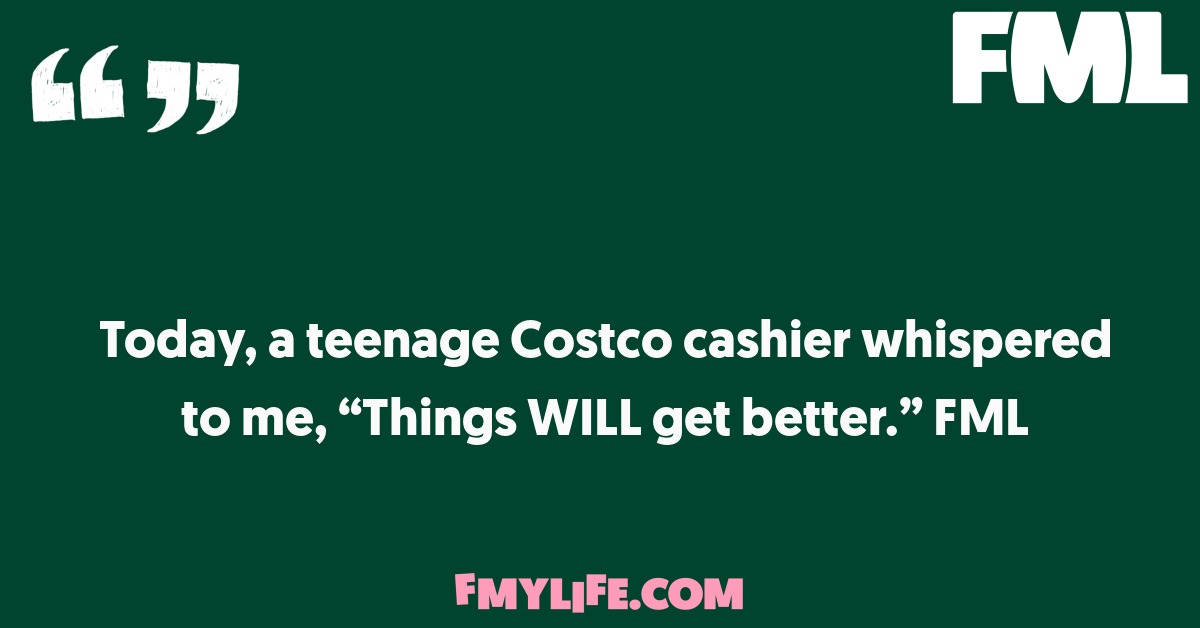 Today, a teenage Costco cashier whispered to me, “Things WILL get better.” FML