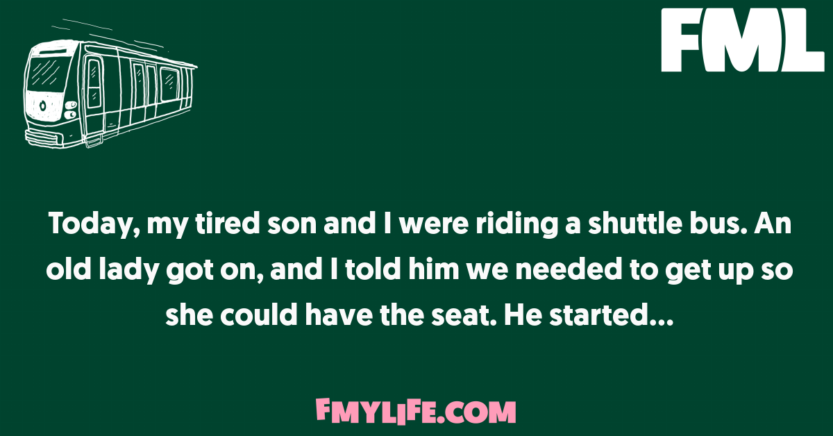 Today, my tired son and I were riding a shuttle bus. An old lady got on, and I told him we...