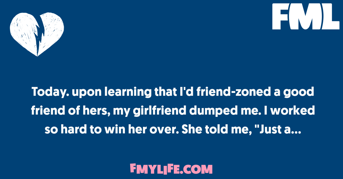 Today. upon learning that I'd friend-zoned a good friend of hers, my girlfriend dumped me....