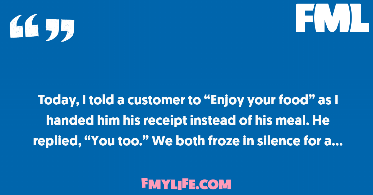 Today, I told a customer to “Enjoy your food” as I handed him his receipt instead of his meal....