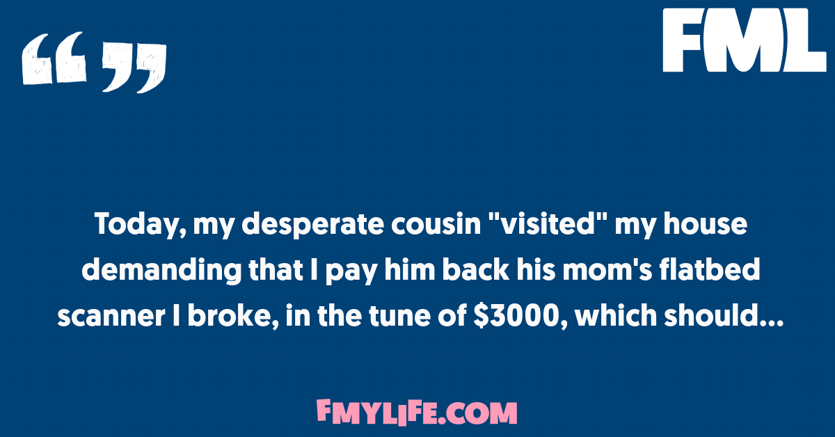 Today, my desperate cousin "visited" my house demanding that I pay him back his mom's flatbed...