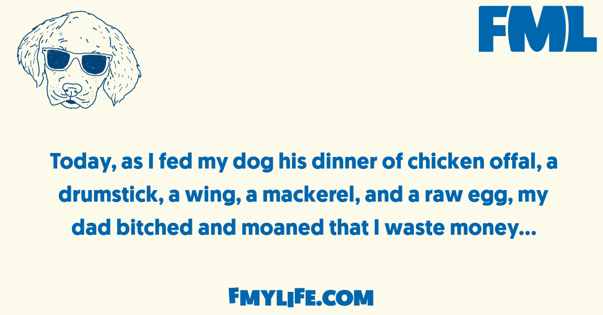 Today, as I fed my dog his dinner of chicken offal, a drumstick, a wing, a mackerel, and a...