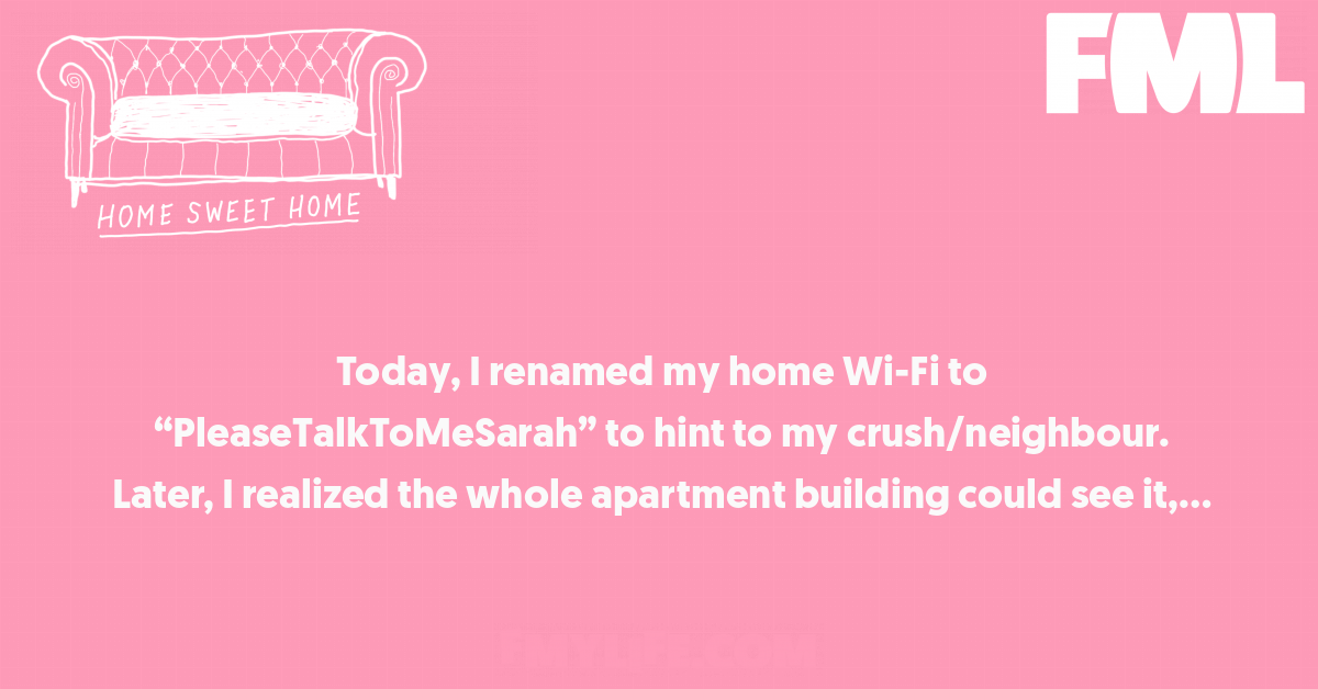 Today, I renamed my home Wi-Fi to “PleaseTalkToMeSarah” to hint to my crush/neighbour. Later,...