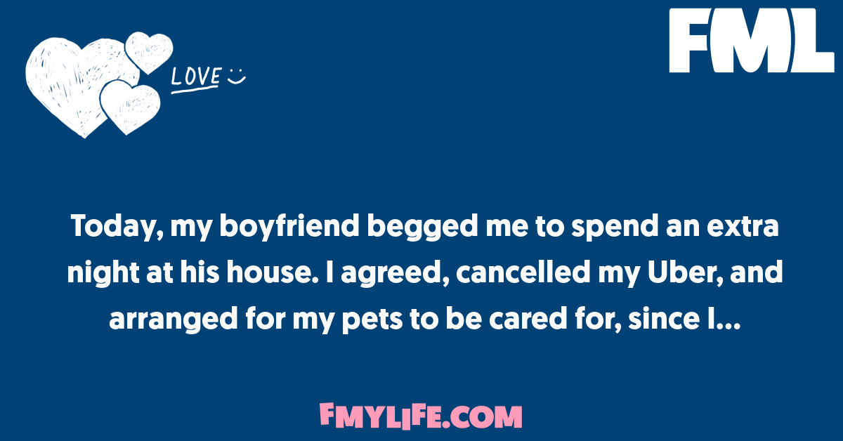 Today, my boyfriend begged me to spend an extra night at his house. I agreed, cancelled my...
