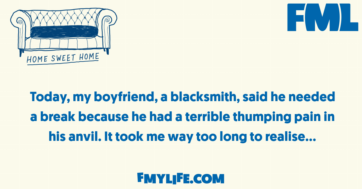 Today, my boyfriend, a blacksmith, said he needed a break because he had a terrible thumping...