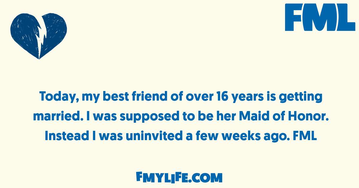 Today, my best friend of over 16 years is getting married. I was supposed to be her Maid of...